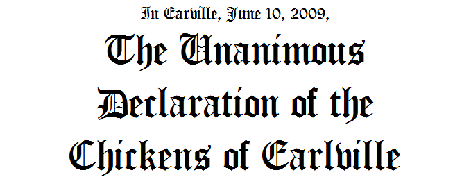 WE hold these truths to be self-evident: that all chickens are created equal,.and are endowed by their Creator with certain unalienable rights, that among these are Life, Liberty, and the pursuit of Happiness ; THAT to secure these rights, governments are instituted among men, deriving their just powers from the consent of the governed; THAT whenever any Form of Government becomes destructive of those ends, it is the right of the people to alter or abolish it; and to institute new Government, laying its foundations on such principles and organizing its powers in such form, as to them shall seem most likely to effect their Safety and Happiness. Prudence, indeed, will dictate that governments long established should not be changed for light and transient causes; and accordingly all experience has shown, that mankind are more disposed to suffer, while evils are sufferable, than to right themselves by abolishing the forms to which they are accustomed. But when a long train of abuses and usurpations, pursuing invariably the same Object, evinces a design to reduce them under absolute Despotism, it is their right, it is their duty, to throw off such Government, and to provide new Guards for their future security; SUCH has been the patient sufferance of these Chickens; and such is now the necessity which constrains them to alter their former Systems of government. The History of the present mayor of the Village of Earlville is a history of repeated injuries and usurpations, all having in direct Object the establishment of an absolute Tyranny over these Chickens, and their expulsion from the Village of Earlville. To prove this, let Facts be submitted to a candid world. She has called the board together at times unusual, uncomfortable, and distant from officially published Times, for the sole purpose of disillusioning the public as to what has officially been done. She has refused to honor previous Board's judgements and decisions regarding Earville Chickens. She has endeavored to prevent the population of these Chickens; for that purpose constructing Laws of Obstruction of Domestic Animals, which do not even pretend to conform to the Aforementioned created Equality, namely, the allowance of Horses, but not Chickens. For attempting to take away our previously obtained permission in good Faith, and abolishing out most Established Laws, and altering fundamentally the Forms of government. She has sent hither a swarm of visits to harass us, for imagined complaints. She has excited domestic insurrections among us. In every stage of these Oppresions We have Petitioned for Redress in the most humble terms: OUR repeated Petitions have been answered only by repeated injury. A mayor, and conspiring trustees, whose character is thus marked by every act which may define Tyrants, is unfit to be Representatives of a free people. Nor have we been wanting in attentions to our board. We have warned them from time to time of attempts by their Legislation to extend an unwarrantable Restriction over us. We have reminded them of the circumstances of our Emmigration and Settlement here. We have appealed to their native Justice and Magnimity, and we have conjured them by the ties of our common Location to disavow these Usurpations, which, would inevitable stop our Complaints and FOIL Requests. They, too, (with the exception of One) have been deaf to the voice of Justice and of Consanguinity; WE, THERFORE, THE REPRESENTATIVES OF THE UNITED CHICKENS OF EARLVILLE, appealing to the Supreme Judge of Creation for the rectitude of our intentions, do in the Name, and by Authority, of the Good Chickens (and delicious pre-offspring) of this Village, solemnly publish and declare, that these Chickens are, and of Right ought to be, Coexistent with the Residents of Earville, that they are Absolved from all allegiance to the mayor and board of the Village of Earville, and that as Free Chickens, have full power to lay eggs and to do all Acts and Things which Coexistent Chickens may of right do. AND for the support of this Declaration, with a firm reliance on the protection of divine Providence, we mutually pledge to each other our Lives, our Fortunes, our Eggs, and our sacred Honor. Duly scratched, ratified, and supported by New York State under decision by the Courts of Madison County, Wampsville, New York State.